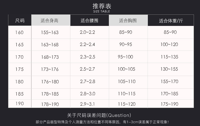 155(S)、165(M)、170(L)、175(XL)、180(XXL)、185(XXL)