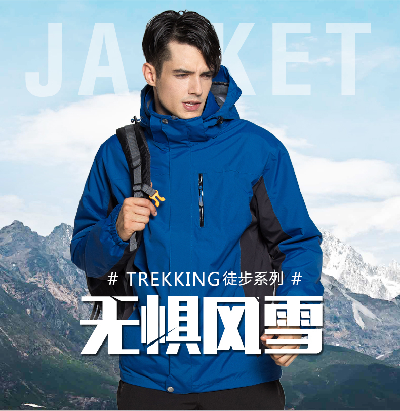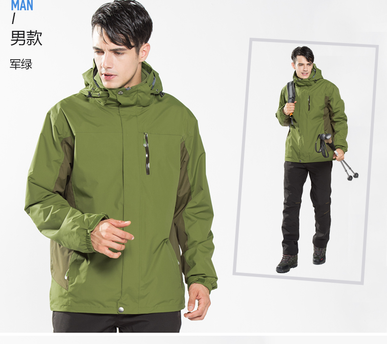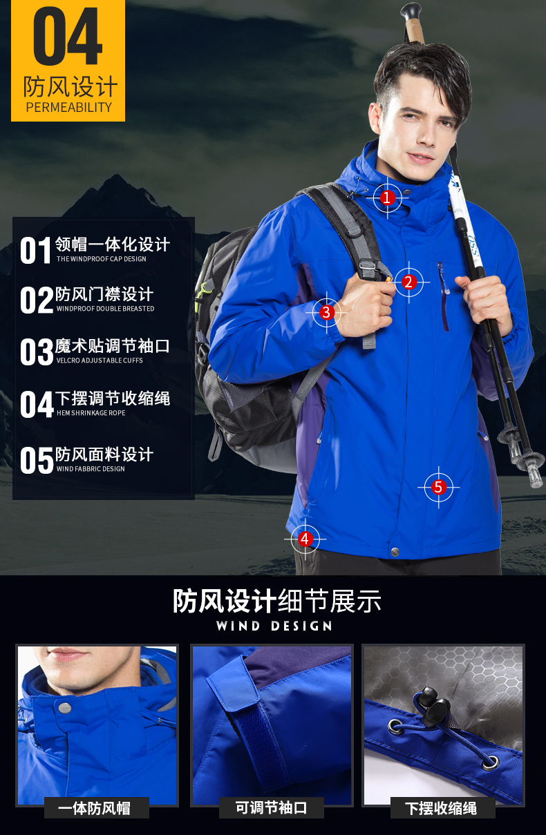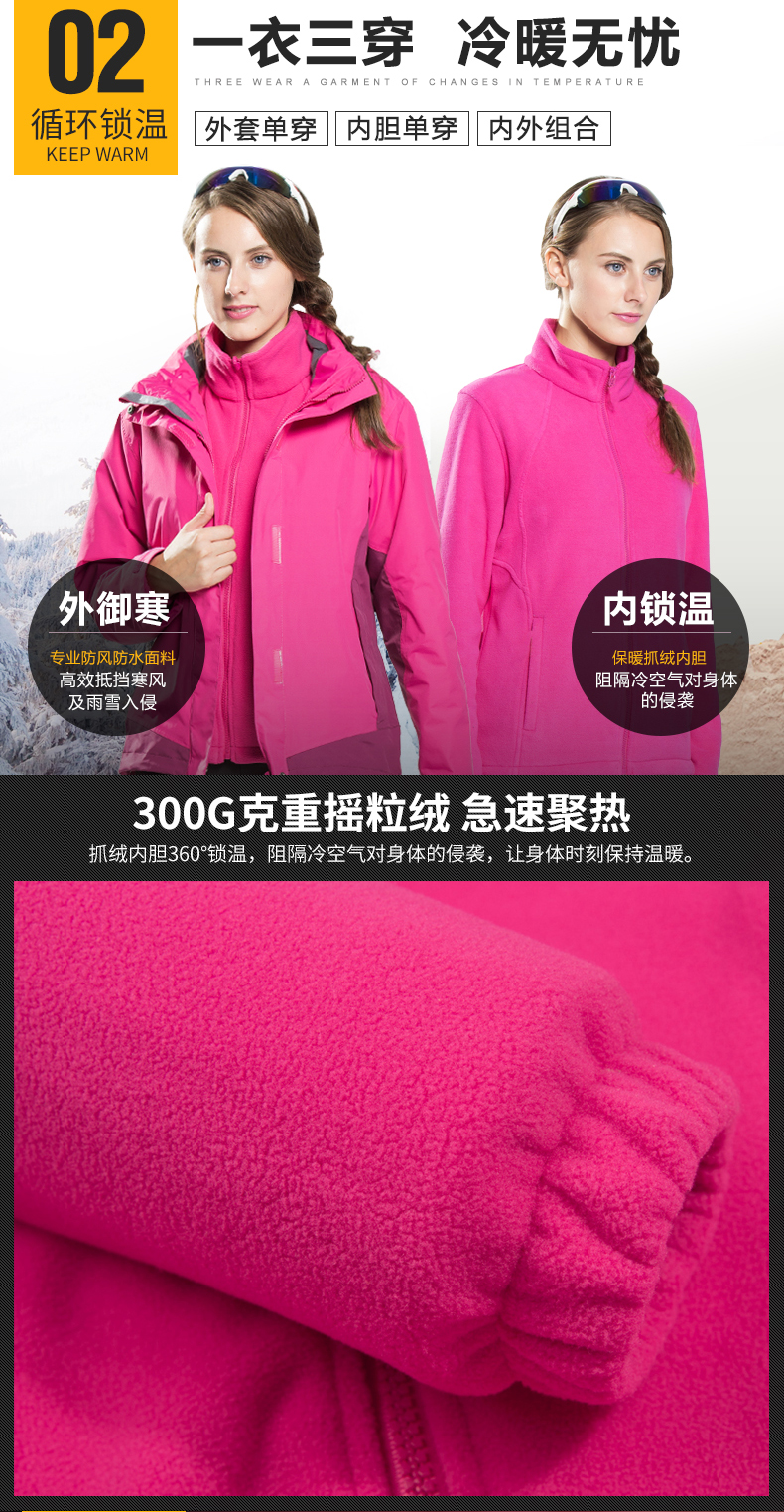 防風防雨,鎖溫保暖,腋下透氣網(wǎng)洞,3合1沖鋒衣,內(nèi)膽可拆卸