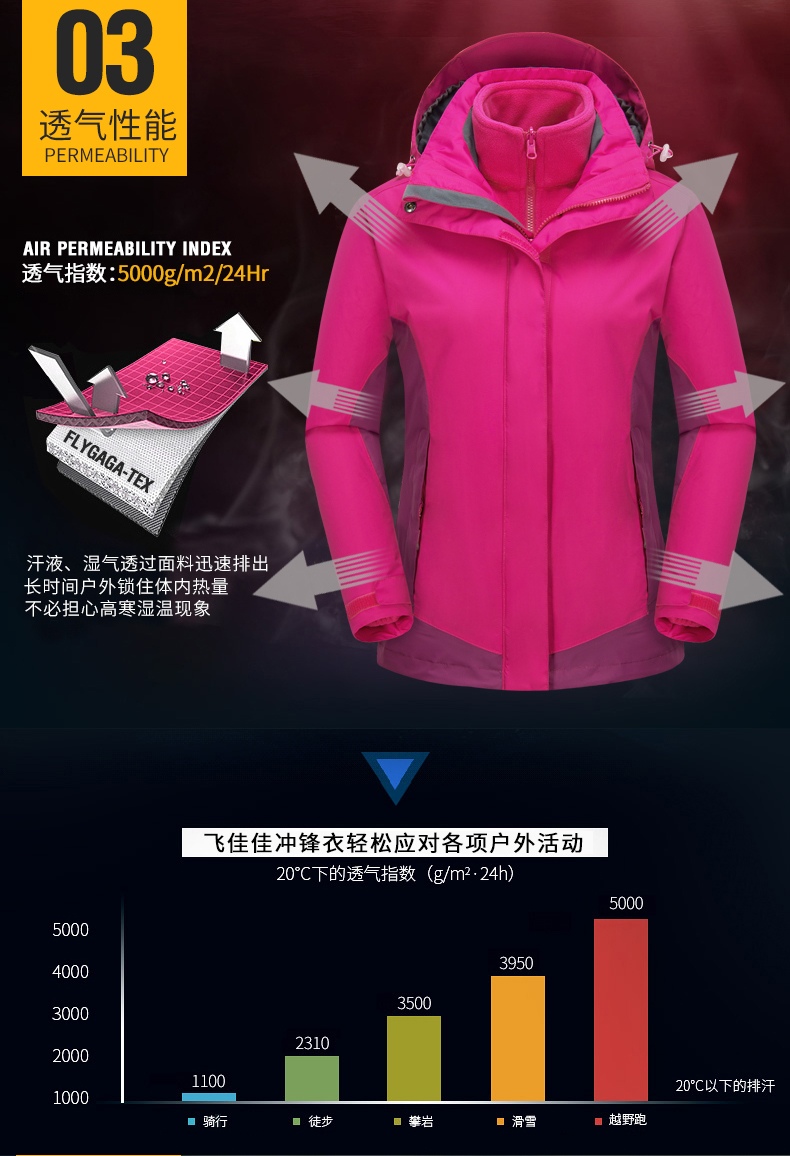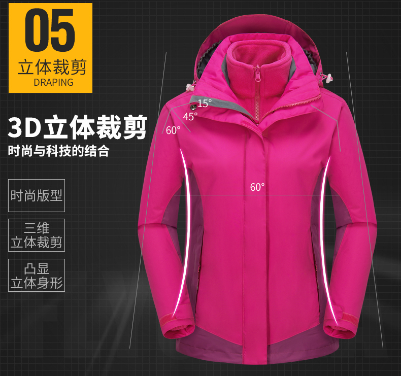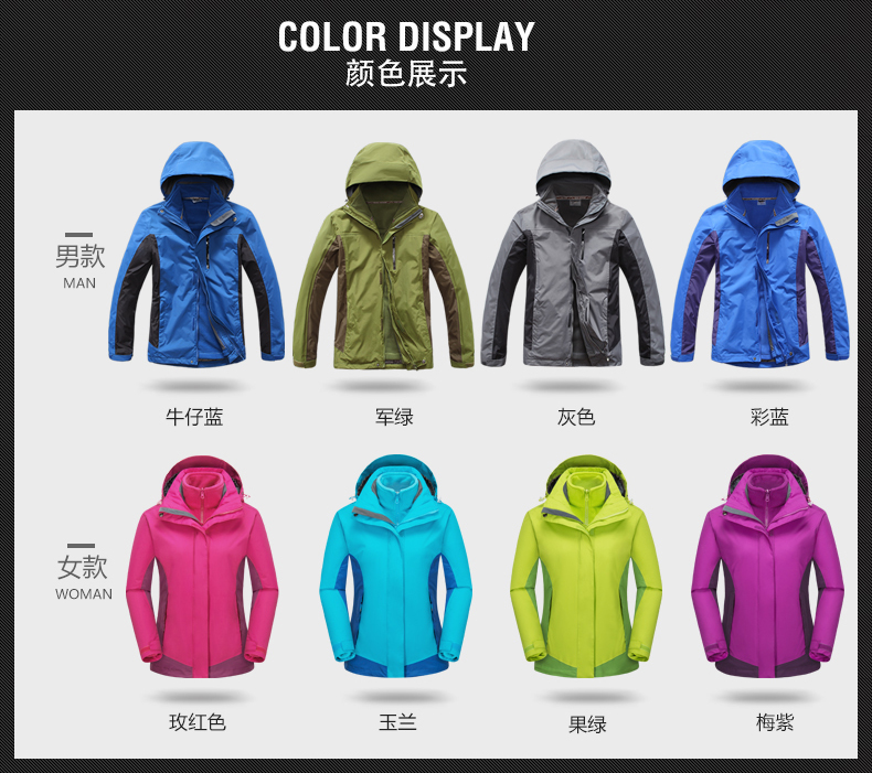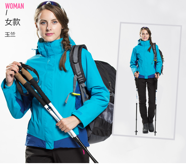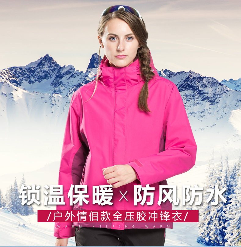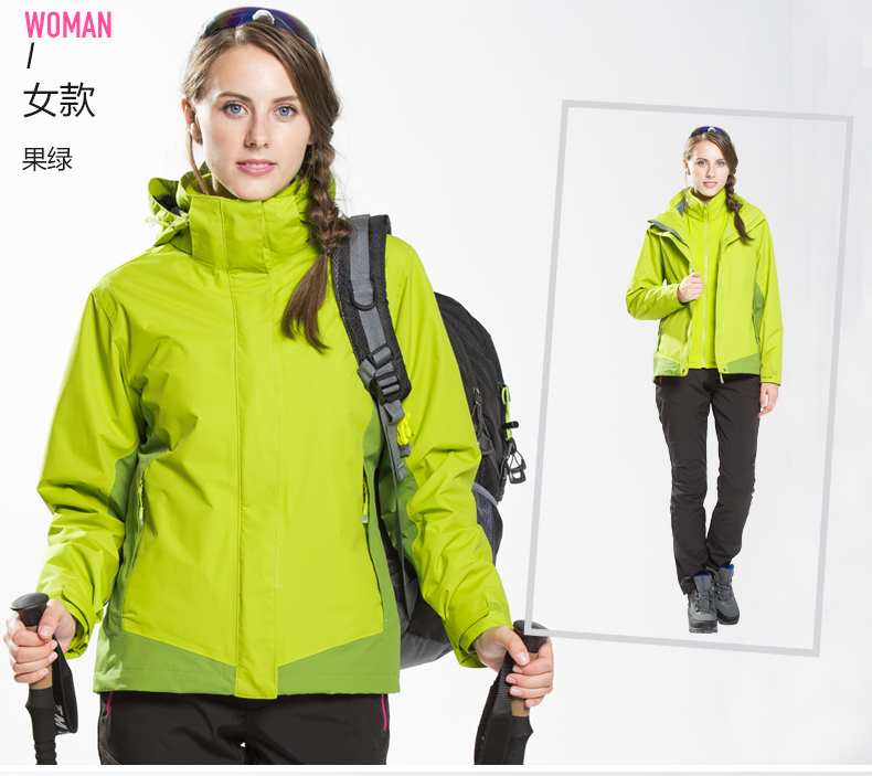 防風防雨,鎖溫保暖,腋下透氣網(wǎng)洞,3合1沖鋒衣,內(nèi)膽可拆卸